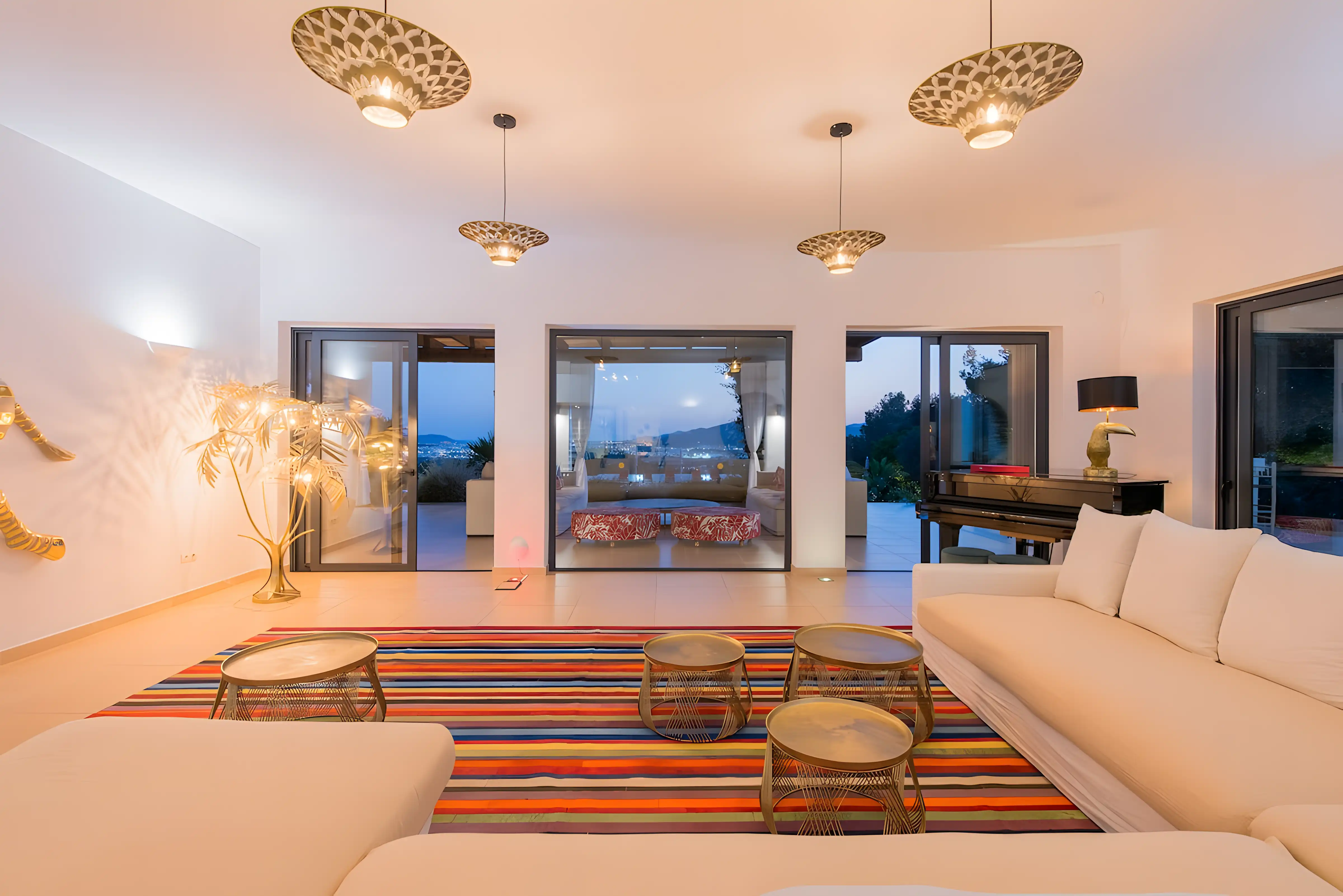 The outdoor areas of the villa are amazing, it is the ideal summer house, with 2 beautiful huge terraces where you have the dining room for 16 people, a long, elegant table in the best Ibizan style so you can enjoy memorable dinners, a bar and a chill out area with super comfortable sofas.