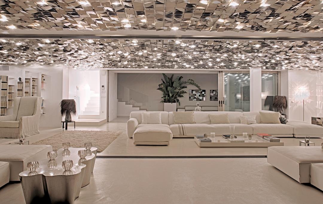 On this floor is the living area, the dining room, the kitchen and the pool. This floor is the center of the house, with stunning views of the sea from everywhere. This area is very special since you feel like you are inside the sea, with floor-to-ceiling sliding glass doors you can join the living room and the pool together in a single space. This area has a very special design detail, a work of art, the ceiling is covered with steel sheets that glow with sunlight, making the atmosphere created magical both day and night.