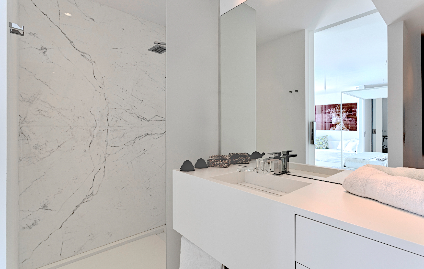 120m2, the bedroom and the bathroom have the same views as the living area, the most beautiful ocean views you can imagine. The wall behind the bed is a beautiful marble wall, the room has a lot of closet space and a great plus is that it has a jacuzzi on the terrace with ocean views ideally to enjoy the sunset.